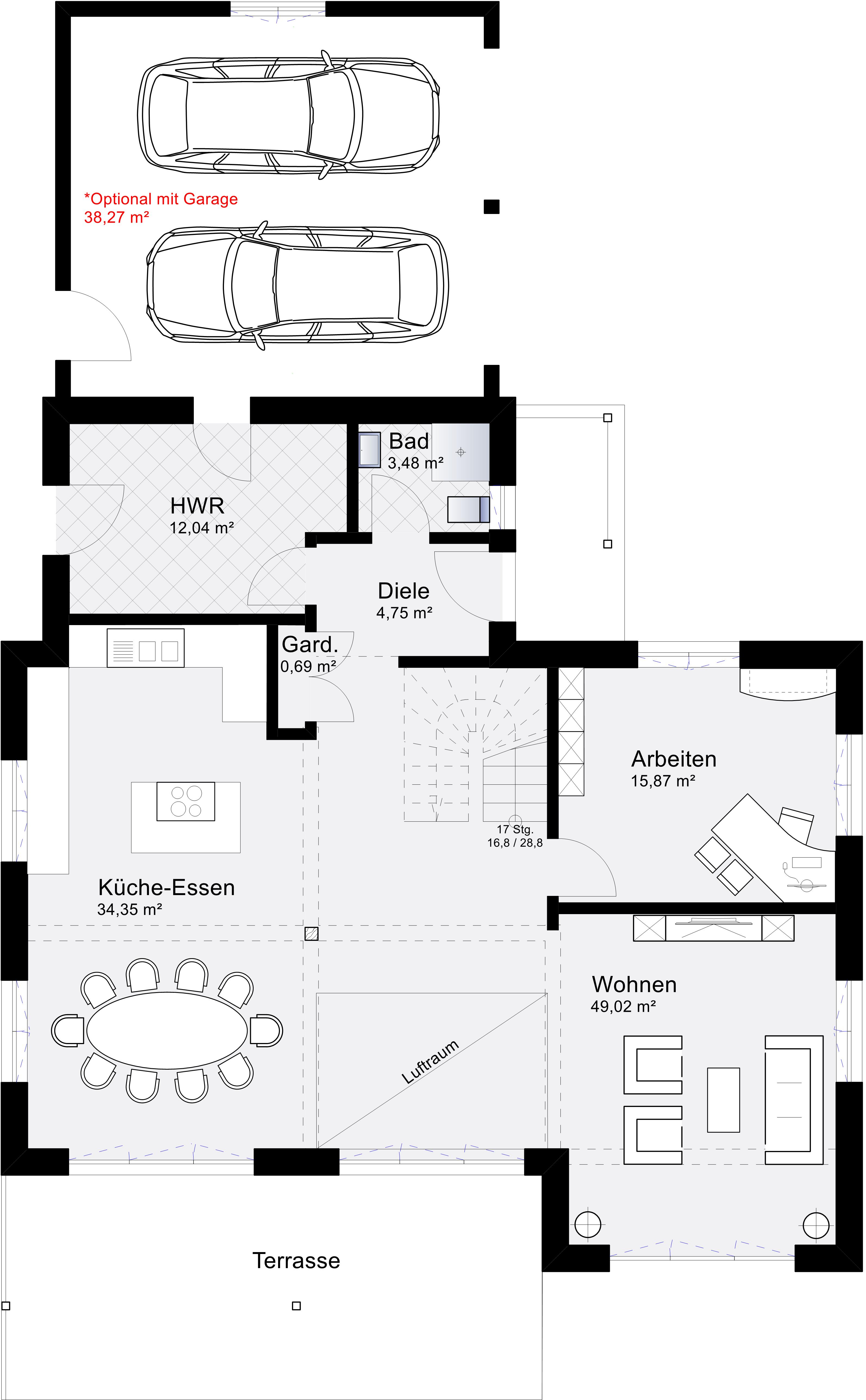 - Offene Raumaufteilung: Küche, Esszimmer und Wohnzimmer verschmelzen zu einem einladenden Wohnbereich mit fließenden Übergängen. Der große Luftraum im Wohnbereich sorgt für eine beeindruckende Offenheit und bietet einen Blick ins Obergeschoss.