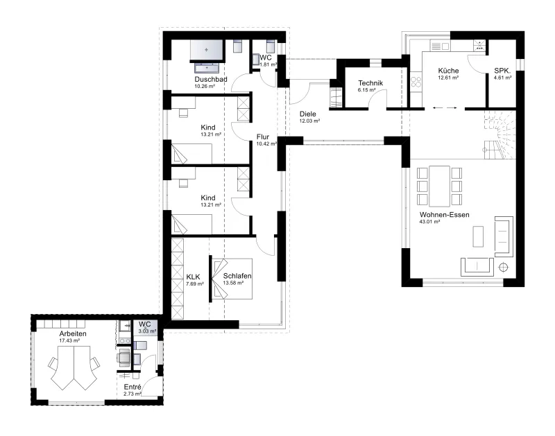 Zweigeteilter Grundriss für klare Struktur und Lebensqualität